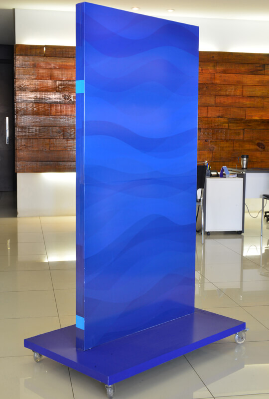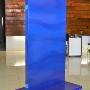 Totem em ACM adesivado com estrutura interna de metalon, base com rodízios facilitando a locomoção para outros ambientes e bolsos em acrílico para colocação de panfletos e revistas.